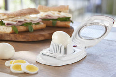 Made from long lasting, high impact plastic and stainless steel, the Egg Cutter with two overlay cutting options; one for slicing, one for wedges. Small in size and storage-friendly.  Features a non-slip base that grips the countertop when slicing and is dishwasher safe.