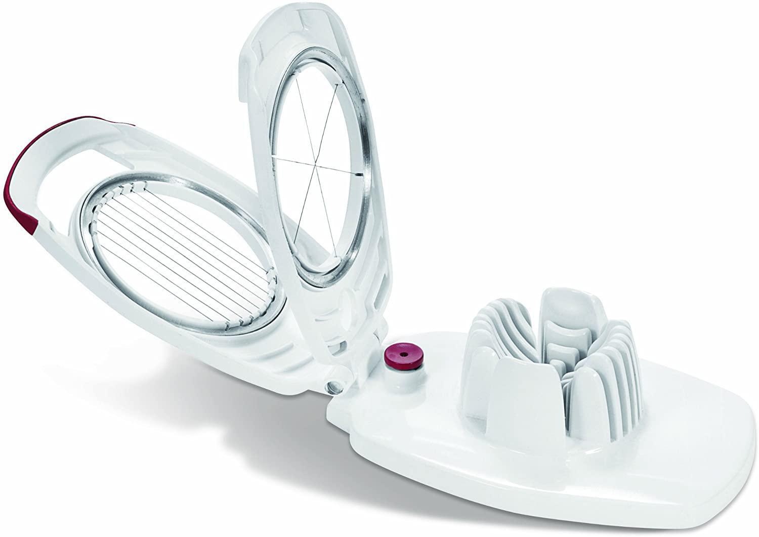 Eggs are a near perfect food. And to help perfectly prep eggs for salads and side dishes, the multi-purpose Zyliss Egg Cutter allows eggs to be safely hardboiled and then sliced or wedged cleanly and quickly. Use the integrated shell-piercing tool to vent a small hole in the egg to prevent the eggshell from cracking while boiling. When eggs are hardboiled and ready to be sliced or wedged, use the stainless steel cutting wires to cut cleanly through the delicate egg.